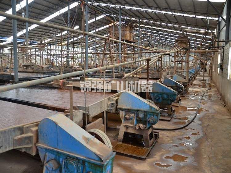 云錫式搖床設(shè)備是我國云南錫業(yè)機(jī)械制造有限公司對原蘇式CC-2型搖床進(jìn)行改進(jìn)而成,故也稱云錫選礦搖床。云錫式搖床床頭采用凸輪杠桿式,另一些則采用凸輪搖臂搖臂式簡化床頭。云錫選礦搖床設(shè)備床架較簡單,床面采用滑動支承方式。云錫式搖床床面與6S搖床面基本相同,不同于6S搖床在縱向上有若干個(gè)斜坡。磨床采用生漆、生漆(生漆與鍛石膏混合物)、玻璃鋼或聚氨酯作耐磨層,有粗砂床、細(xì)砂床、礦泥床3種。一般粗砂床上鋪梯形來復(fù)條,細(xì)砂床上鋪有鋸齒形復(fù)條,礦泥床面為三角形溝槽。