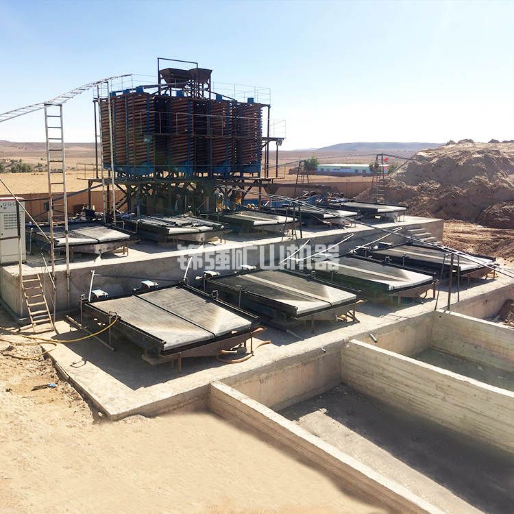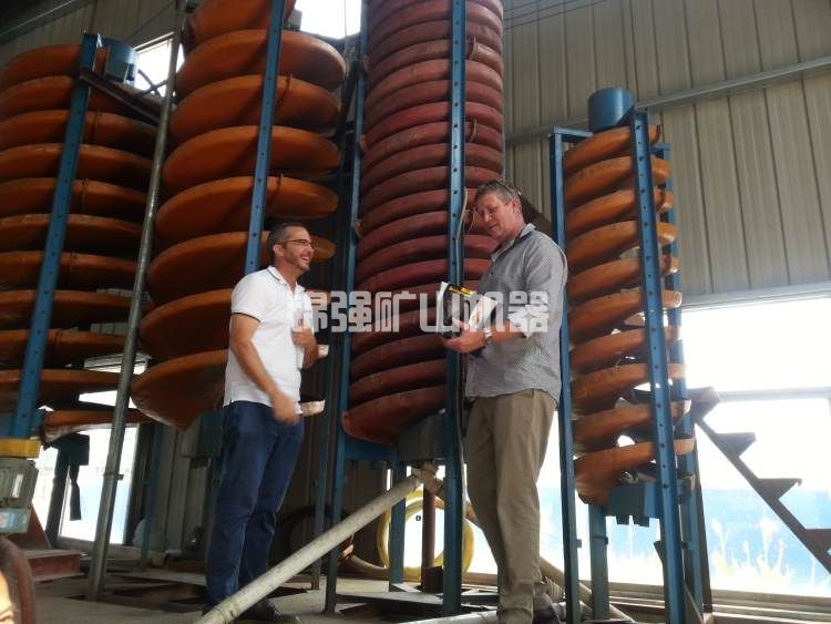 將玻璃鋼螺旋溜槽立起,校正等分線,用鐵架子或木材固定不動在適合的部位,由泥沙泵將石砂送至螺旋式上頂2個入料出口處,添加填補水,調整礦槳濃度值,礦槳當然從高向下漩流,在轉動的斜坡水流量中造成一種慣性力的向心力,以石砂的比例、粒度分布、樣子上的差別,根據漩流的作用力和向心力的功效,將礦與砂分離,鈦精礦注入鈦精礦斗用管路串接,工業(yè)廢渣流到工業(yè)廢渣斗用管路收到砂池,再用泥沙泵排出去,完成了選礦廠的整個過程。