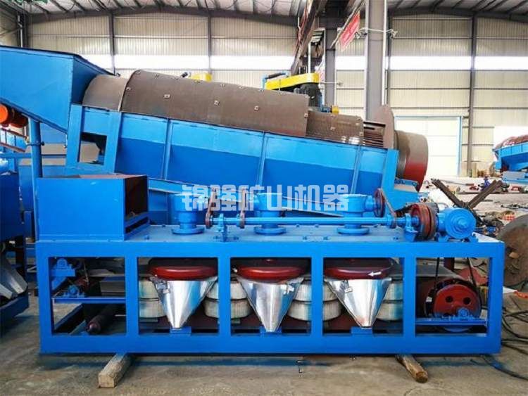 帶式磁選機(jī)的特點(diǎn)是磁系為電磁系且磁系包角很大,為270°。為了改善導(dǎo)熱和防止線圈受潮濕,圓筒內(nèi)充有變壓器油;圓筒轉(zhuǎn)速較慢,每分鐘5轉(zhuǎn),繞圓筒的皮帶以慢速運(yùn)動(dòng),磁性產(chǎn)品被皮帶排出受到良好的脫水作用(磁性產(chǎn)品濃度可達(dá)65%-70%),這對(duì)重介質(zhì)回收和再用是很重要的。