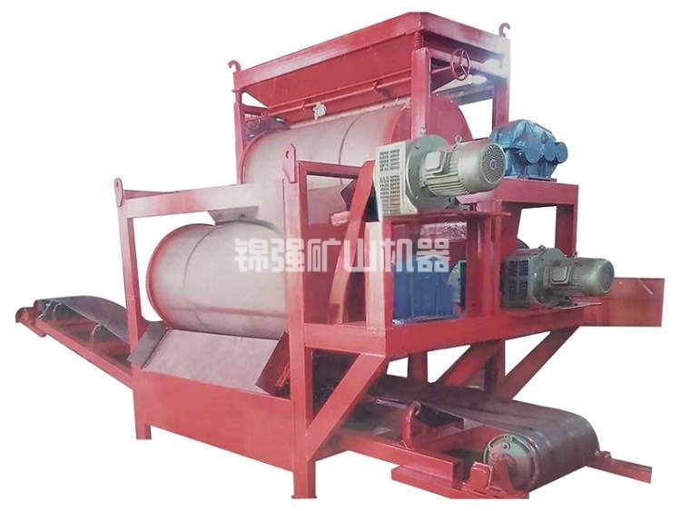 含有磁性物質(zhì)的非磁性物料經(jīng)過電磁振動(dòng)給料機(jī)均勻的分布到強(qiáng)磁雙輥干式磁選機(jī)皮帶上;當(dāng)物料通過強(qiáng)磁輥時(shí),磁性物質(zhì)由于受磁力的吸附作用被吸附到強(qiáng)磁輥上,被皮帶帶入磁性物料集料斗中;非磁性物料及未被選凈的磁性物料隨著皮帶的轉(zhuǎn)動(dòng)受重力作用,脫離磁場并下落到下一層皮帶上繼續(xù)選別;這樣,經(jīng)過幾道磁選之后就能選別出合格產(chǎn)品。